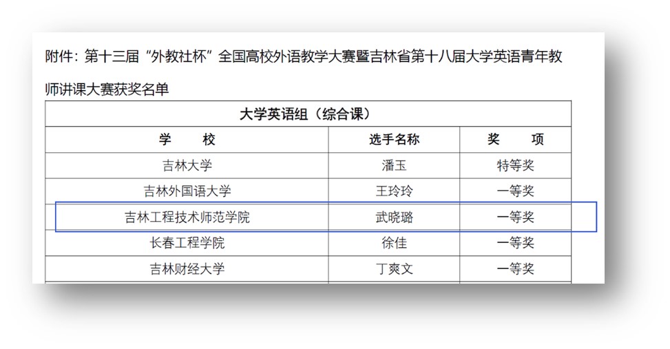 省级决赛各组别共收到来自吉林大学、吉林外国语大学等36所院校共计85位选手提交的参赛视频。经过近两个月的精心准备、积极备赛,我院武晓璐老师晋级省级总决赛,以其良好的语音面貌,扎实的英语教学基本功,先进的教学理念和优秀的教学设计,荣获大学英语综合课一等奖;张岩老师荣获大学英语视听说组三等奖,刘思宁老师荣获英语专业组三等奖。