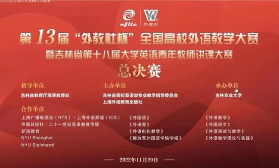 2022年11月20日,第十三届“外教社杯”全国高校外语教学大赛暨吉林省第十八届大学英语教师青年教师讲课大赛省级总决赛在吉林农业大学圆满落下帷幕。我院武晓璐老师、张岩老师和刘思宁老师代表我校分别参加了大学英语组(综合组)、大学英语组(视听说组)及英语专业组(综合课)的省级比赛,获得佳绩。