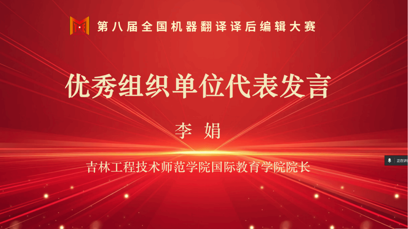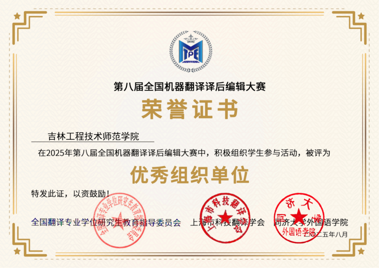 2025年7月,第八届全国机器翻译译后编辑大赛在线上成功举办。全国机器翻译译后编辑大赛是业内首个以机器翻译译后编辑为特色的专业赛事,已连续三年入选中国外文局"综合水平最高的30项国内翻译赛事"榜单。本届大赛由全国翻译专业学位研究生教育指导委员会指导,上海市科技翻译学会与同济大学外国语学院联合主办。在这场汇聚全球翻译人才的专业赛事中,yl23455永利集团凭借积极的组织态度与出色的统筹工作,成功斩获 “优秀组织奖”。学院院长李娟教授因在赛事组织过程中的突出贡献,获评 “优秀组织个人”,并受邀在颁奖典礼上作为高校代表发言。