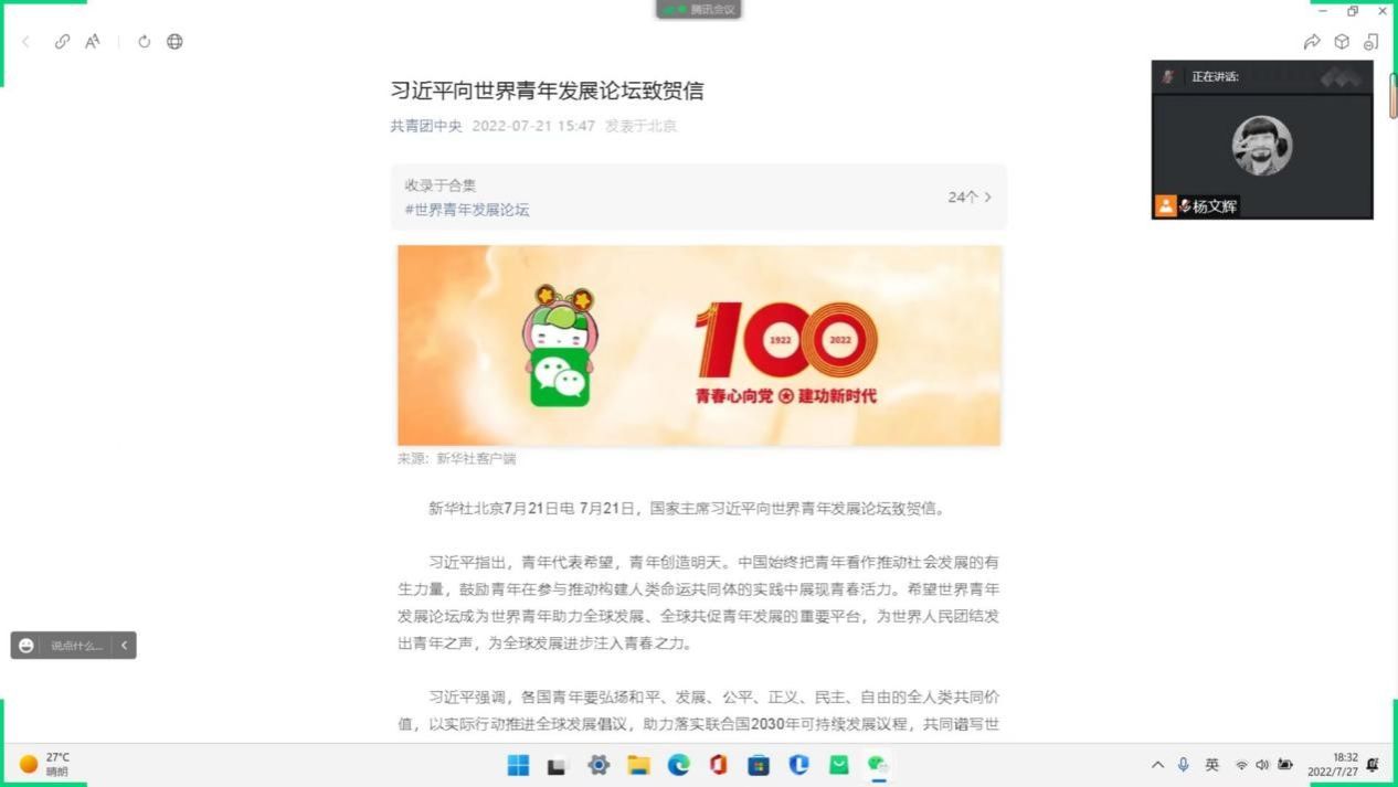 7月21日,国家主席习近平向世界青年发展论坛致贺信,迅速掀起青年学习致贺信精神的热潮。yl23455永利集团青年紧跟步伐,通过网络、电视等多形式学习总书记的致贺信,同时,yl23455永利集团各班长召开线上会议,带领班级全体青年进一步学习感悟。